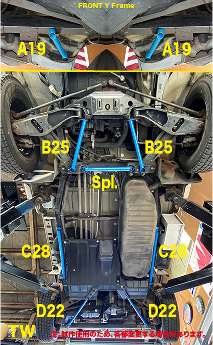 TWの場合ワゴンでリヤにも人が乗ることを重視しています。そこで乗り心地を犠牲にせず、ハンドリングが安定して、高速道路でもドライバーはステアリングに指1本で直進性を損なわず、追い越しなどの車線変更時のステアリングに残る修正舵を最小限になるように工夫してあります。セットには含まれませんが、ロワアームの間を繋ぐバーを入れるとステアリングレスポンスがかなり向上します。TT系で発生していた、キャビンと荷台部分の別の動きが、ボディシェルが一体になったことでかなり緩和されています。ボディ全体が動くので、TT系とは全く違ったフレーム補強になりました。基本的なフレーム補強の部位は変わりませんが、各部のパイプ径がTVと比較しても変化しています。