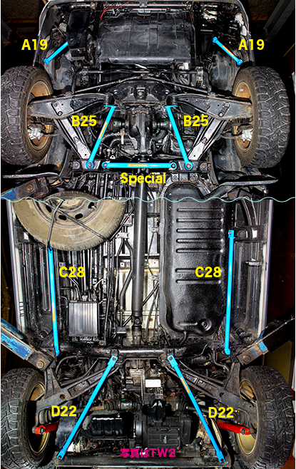 TWの場合ワゴンでリヤにも人が乗ることを重視しています。そこで乗り心地を犠牲にせず、ハンドリングが安定して、高速道路でもドライバーはステアリングに指1本で直進性を損なわず、追い越しなどの車線変更時のステアリングに残る修正舵を最小限になるように工夫してあります。セットには含まれませんが、ロワアームの間を繋ぐバーを入れるとステアリングレスポンスがかなり向上します。TT系で発生していた、キャビンと荷台部分の別の動きが、ボディシェルが一体になったことでかなり緩和されています。ボディ全体が動くので、TT系とは全く違ったフレーム補強になりました。基本的なフレーム補強の部位は変わりませんが、各部のパイプ径がTVと比較しても変化しています。